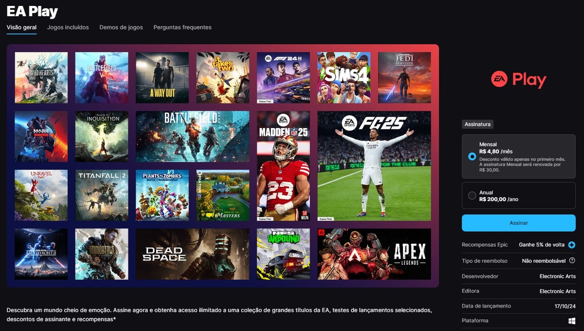 Hoje a Epic Games lançou a assinatura de jogos da Electronic Arts, o EA Play em sua loja, e todos podem assinar o primeiro mês pelo valor promocional de R$ 4,80.
