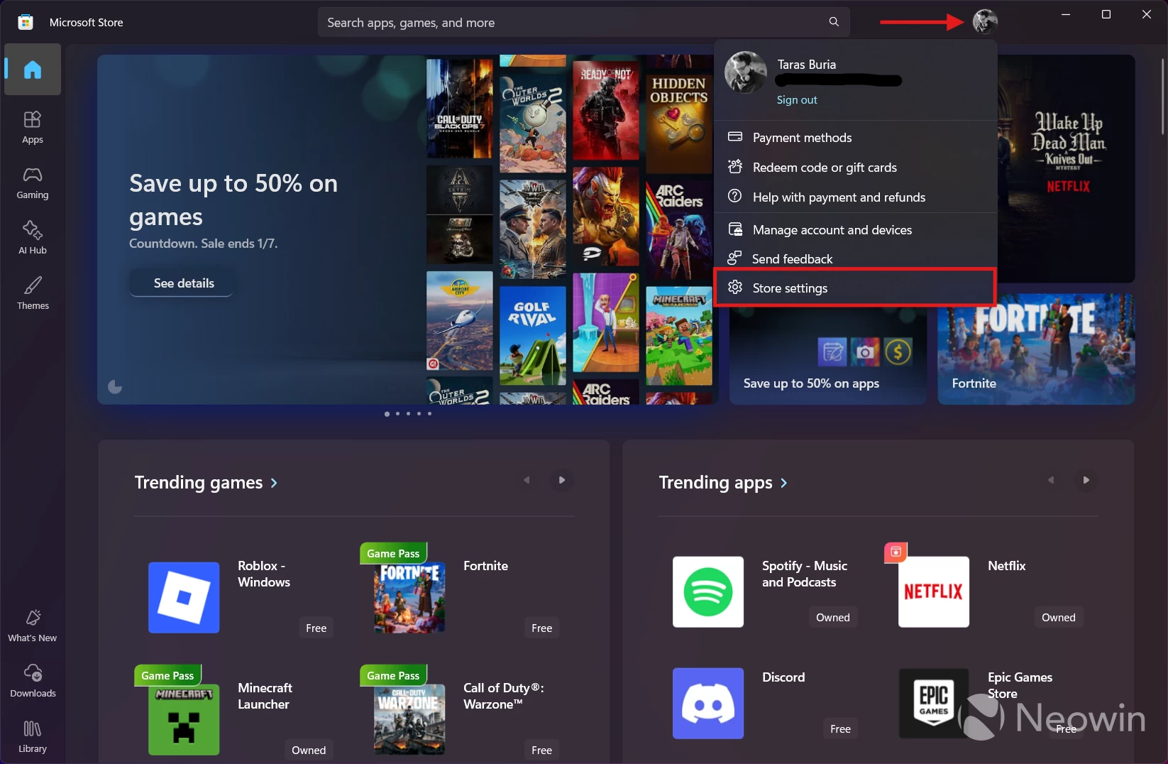 Acesse a Microsoft Store, clique no ícone do seu perfil e selecione Configurações da loja .